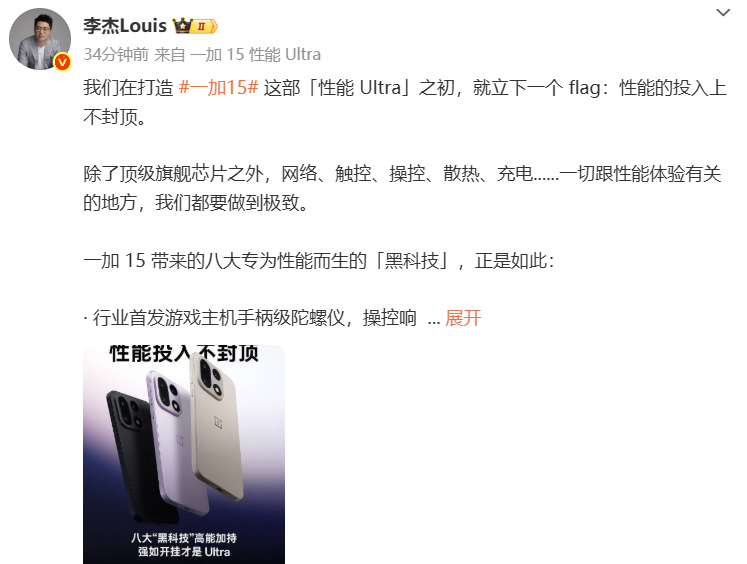 【CNMO科技消息】10月21日,CNMO注意到欧皇证券,一加中国区总裁李杰发文称,一加15配备八项黑科技,每一项都是行业首发、独家、顶级,并定位为“性能Ultra”(性能的投入上不封顶)。值得一提的是,该机将于10月27日19:00正式发布。
