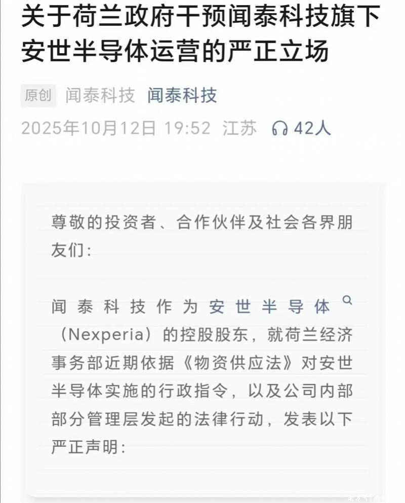 《声明》称,闻泰科技作为安世半导体(Nexperia)的控股股东,就荷兰经济事务部近期依据《物资供应法》对安世半导体实施的行政指令,以及公司内部部分管理层发起的法律行动,发表严正声明坚决反对将商业问题政治化。